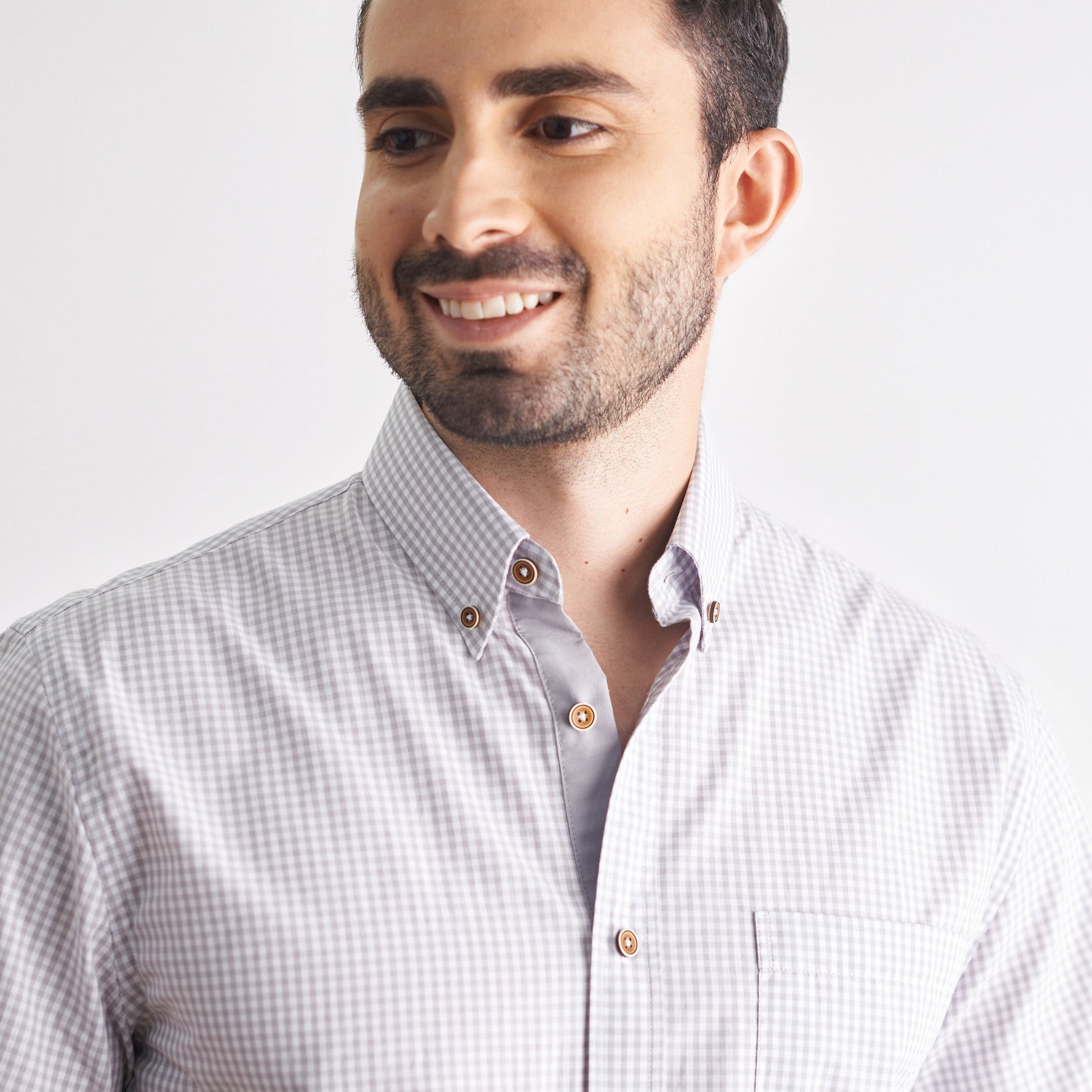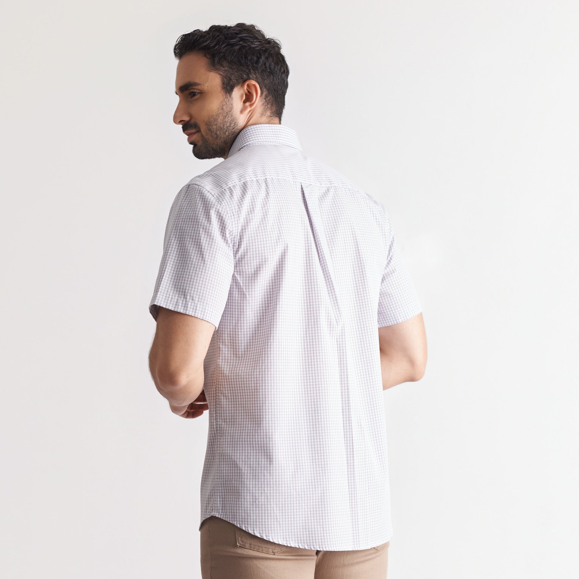 Camisa casual, regular fit, cuello button down, manga corta, 1 bolsillo, prense en espalda, diseño fondo entero. Combinación en cuello interno y cartera interna. 60% algodón 40% poliéster.