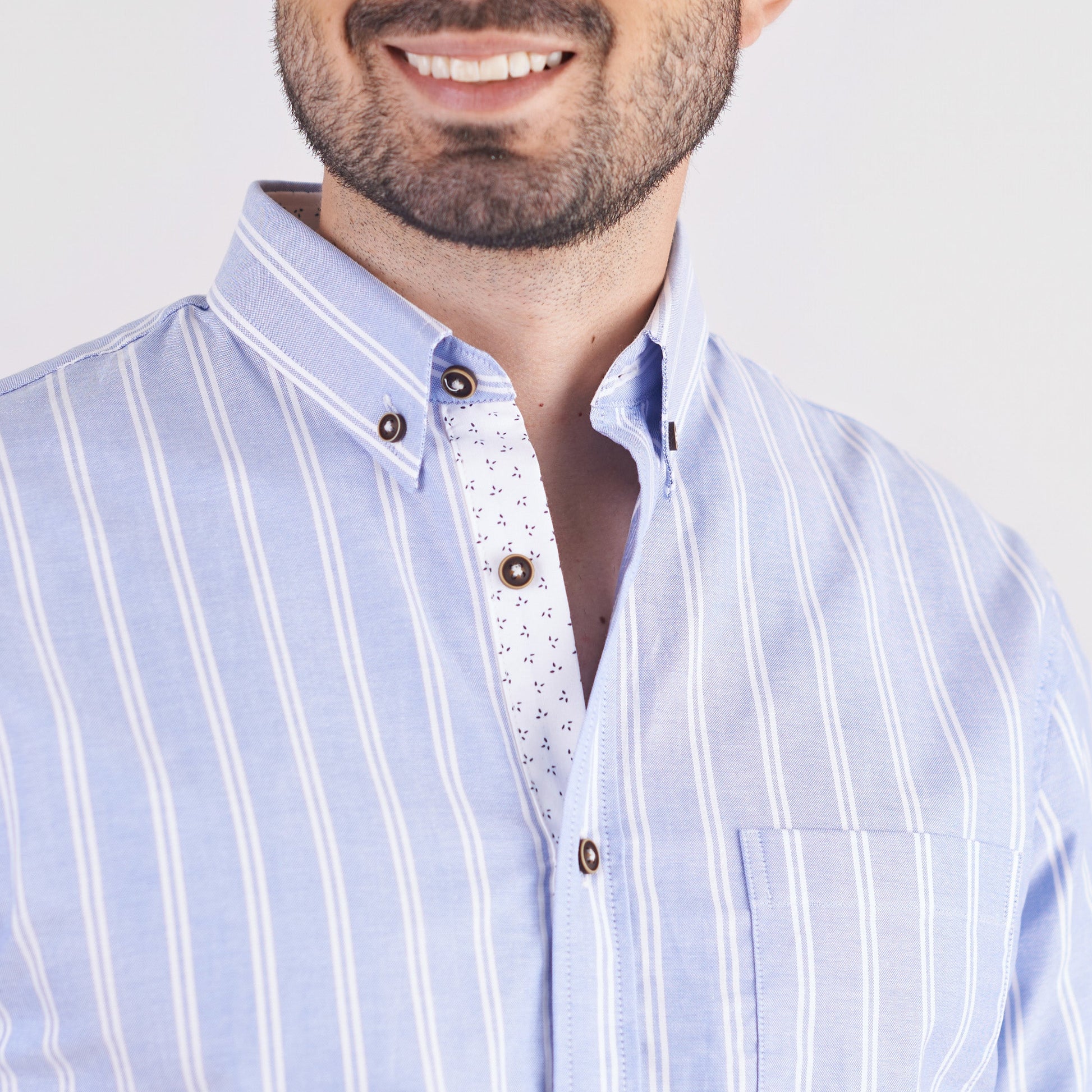 Camisa casual, regular fit, cuello button down, manga corta, 1 bolsillos, prense en espalda, diseño a rayas, combinación en cuello interno y cartera interna. 100% algodón.