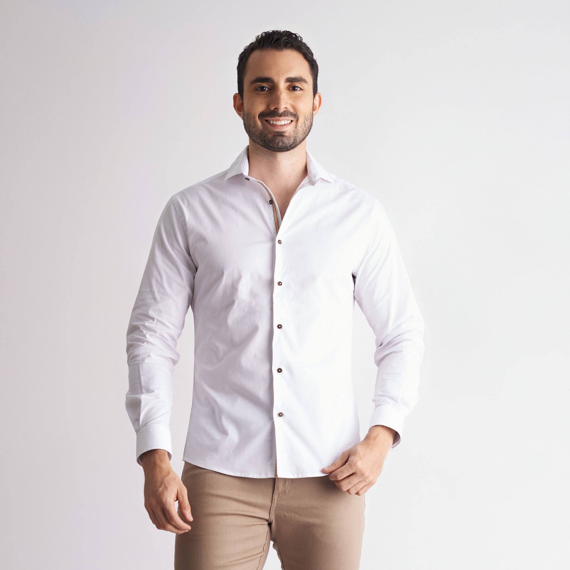 Camisa casual, slim fit, cuello con varilla interna, manga larga, diseño fondo entero, cinta decorativa en cartera interna. 97% algodón 3% elastómero.