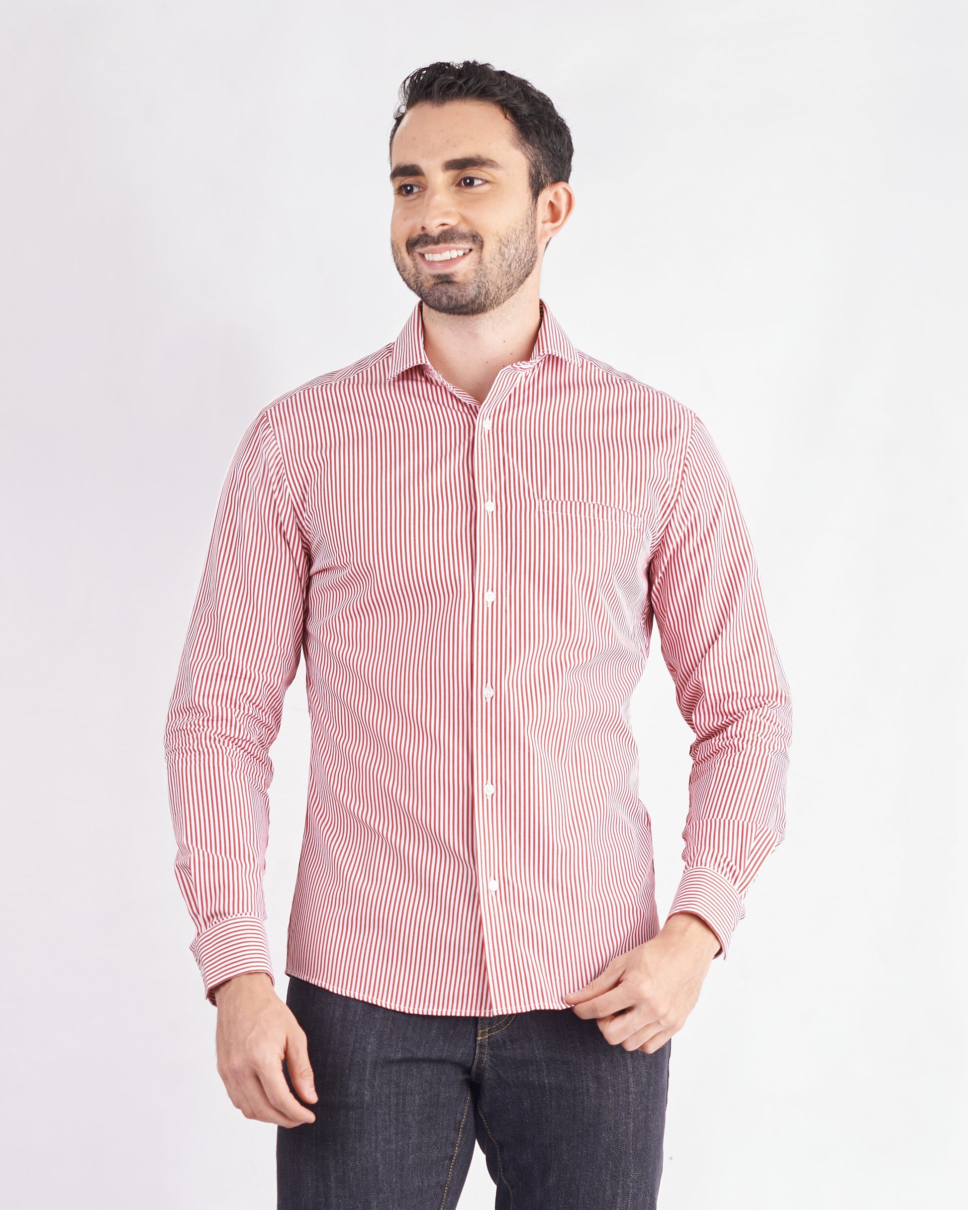 Camisa casual, slim fit, cuello con varilla interna, manga larga, diseño a rayas. 100% algodón.