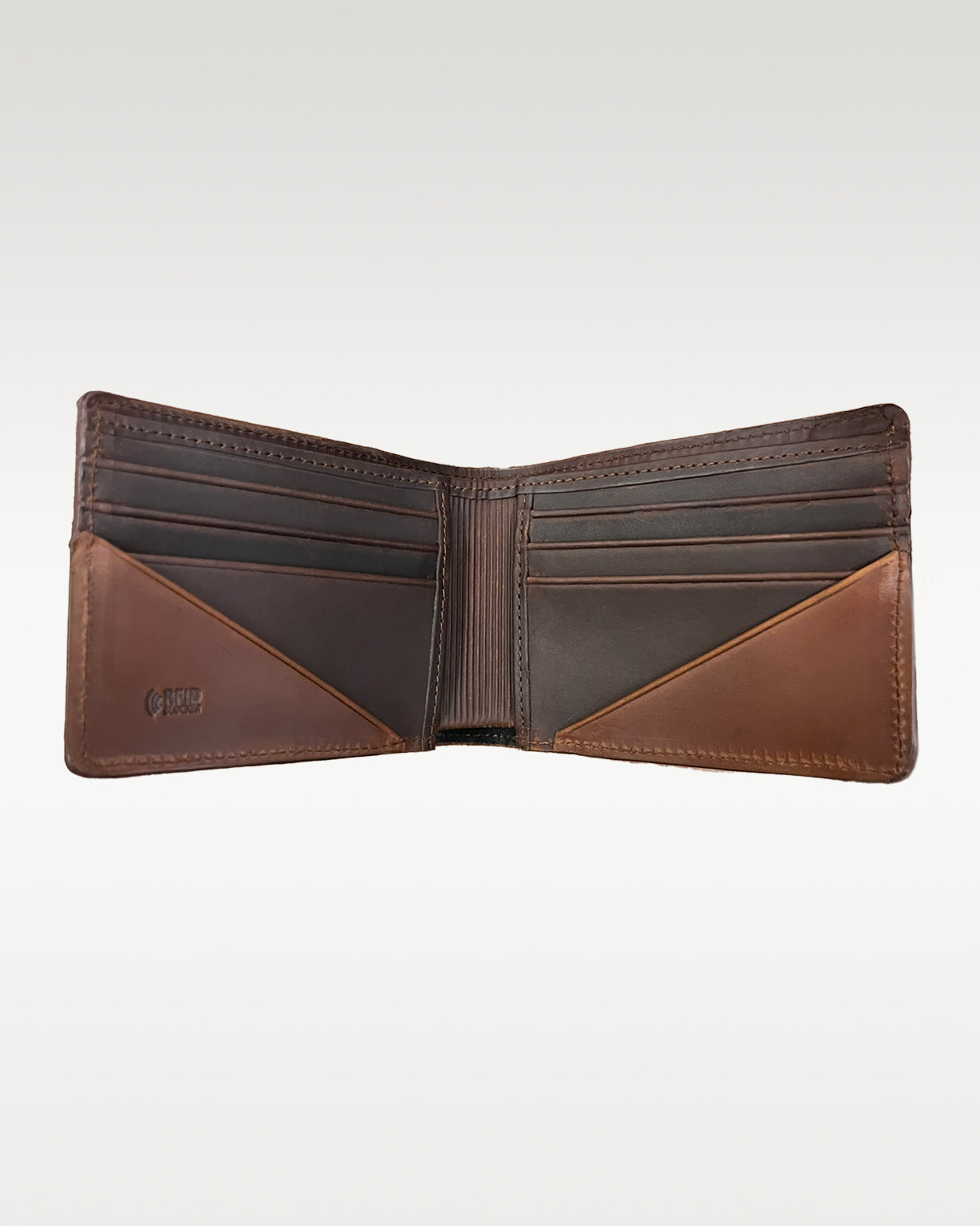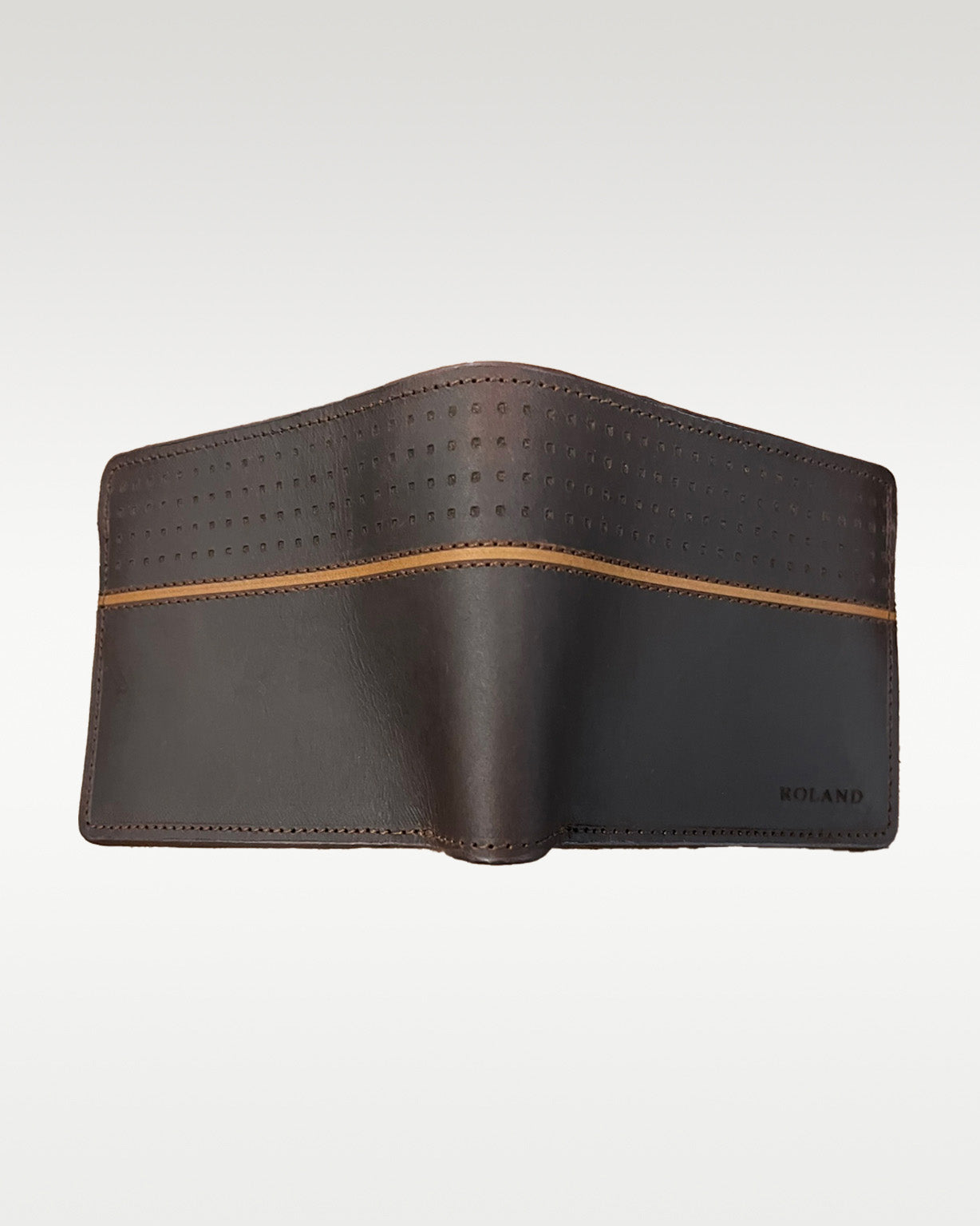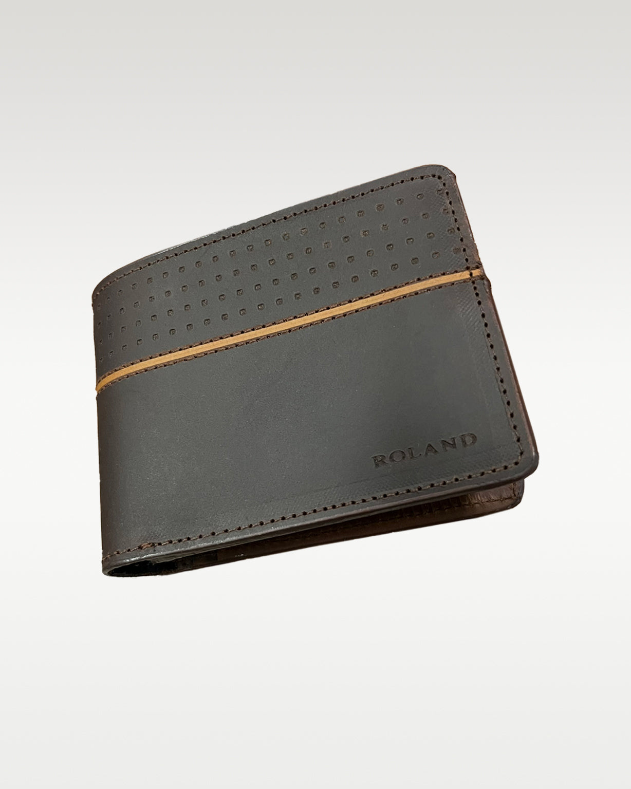 Billetera elaborada en cuero napa y lona, cuenta con 6 organizadores para tarjetas y 2 compartimiento para billetes, marcación con láser logo "ROLAND". Dimensiones: Alto 9,5cm x Ancho 11cm.